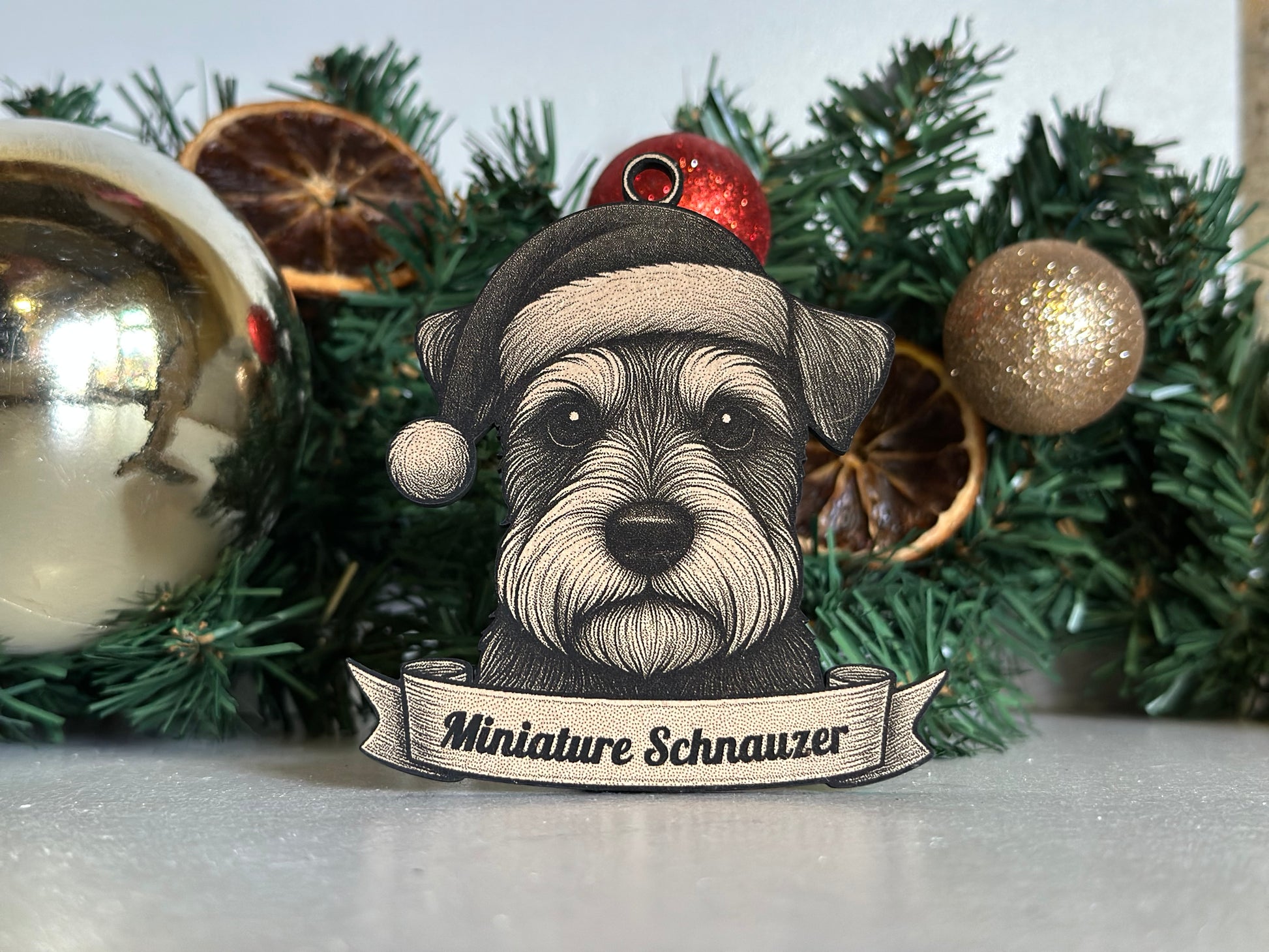 Bring some festive character to your tree with this charming Miniature Schnauzer Christmas bauble. Laser-cut from wood to capture the breed’s signature beard and expressive eyebrows, it can be personalised with your dog’s name to create a unique keepsake or thoughtful gift for Schnauzer lovers.
